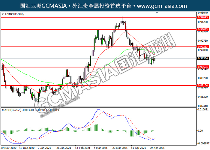 USDCHF,Daily:美瑞震荡下行,目前靠近前期支撑。然而,MACD显示空头动能略减,短期可关注技术性回调为主。上方关注0.9225压力和0.9365压力,下方关注0.9060支撑和0.8910支撑。