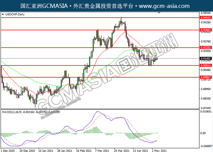 USDCHF,Daily:美瑞震荡上行。MACD已形成金叉,动能转强,短期可关注多头为主。上方关注0.9225压力和0.9365压力,下方关注0.9080支撑和0.8985支撑。