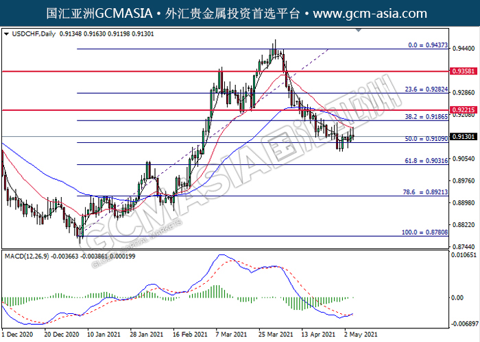 20210506 USDCHF by willy | May 5, 2021 | 美元兑瑞士法郎 | 0 comments GCMAsia-USDCHF USDCHF 2021-05-06 USDCHF,Daily:美瑞突破后持续上行。MACD显示空头动能略减,短期可关注多头趋势。上方关注0.9185压力和0.9220压力,下方关注0.9110支撑和0.9030支撑。