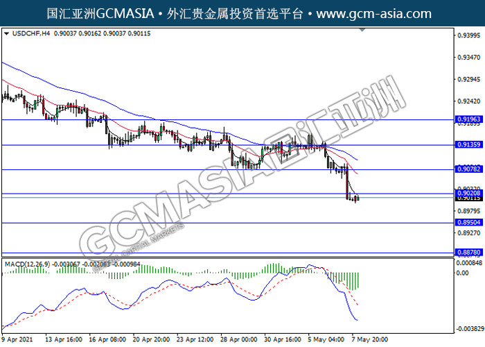 USDCHF,H4:美瑞突破前期支撑,空头排列。然而,MACD空头动能有所略减,短期关注技术性多头反弹为主。上方关注0.9020压力和0.9135压力,下方关注0.8950支撑和0.8880支撑。