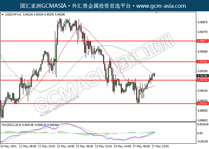 20210518 USDCHF by willy | May 18, 2021 | 美元兑瑞士法郎 | 0 comments USDCHF,H1:美瑞低位反弹。MACD开始形成金叉,动能转强,短期可关注技术性回调为主。上方关注0.9045压力和0.9065压力,下方关注0.9025支撑和0.9000支撑。