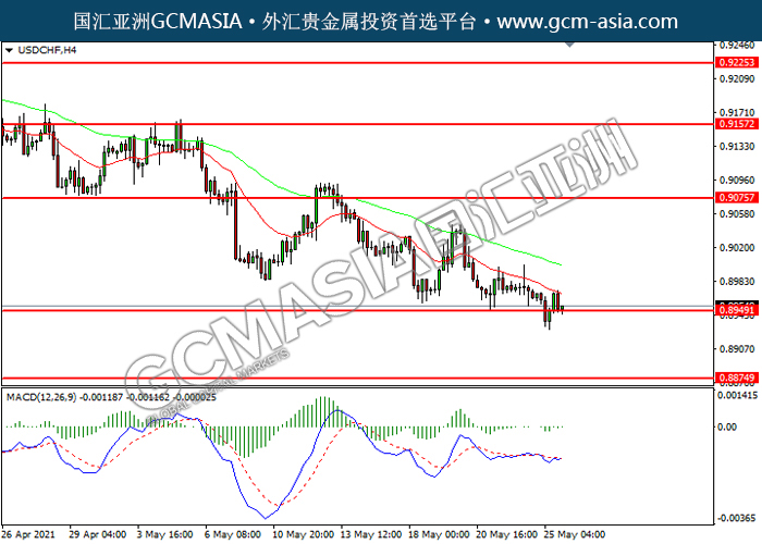 USDCHF,H4:美瑞震荡下行,目前测试前期支撑。然而,MACD空头动能略减,短期可关注技术性回调为主。上方关注0.9075压力和0.9155压力,下方关注0.8950支撑和0.8875支撑。