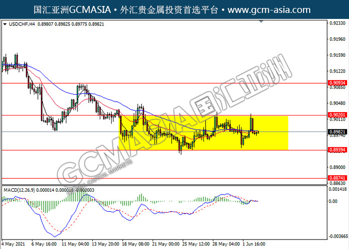 20210603 USDCHF-午间 by keyk | Jun 3, 2021 | 美元兑瑞士法郎 | 0 comments USDCHF,H4:美瑞仍区间震荡交易。MACD缺乏动能和清晰方向,建议等更明确的信号出现才进入市场。上方关注0.9020压力和0.9095压力,下方关注0.8940支撑和0.8875支撑。