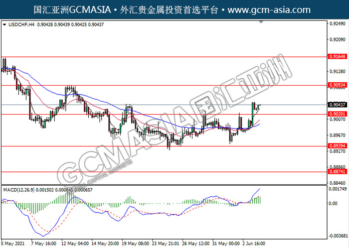 20210604 USDCHF-午间 by keyk | Jun 4, 2021 | 美元兑瑞士法郎 | 0 comments GCMAsia-USDCHF USDCHF 2021-06-04 USDCHF,H4:美瑞突破前期压力,多头排列。MACD动能略增,短期继续看多为主。上方关注0.9095压力和0.9165压力,下方关注0.9020支撑和0.8940支撑。