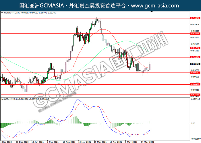 USDCHF,Daily:美瑞震荡上行。MACD多头动能略增,短期可关注多头为主。上方关注0.9095压力和0.9175压力,下方关注0.8955支撑和0.8850支撑。
