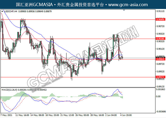 20210607 USDCHF-午间 by keyk | Jun 7, 2021 | 美元兑瑞士法郎 | 0 comments USDCHF,H4:美瑞空头排列,目前测试前期支撑。MACD形成死叉,动能略减,若突破继续看空为主。上方关注0.9040压力和0.9090压力,下方关注0.8985支撑和0.8935支撑。