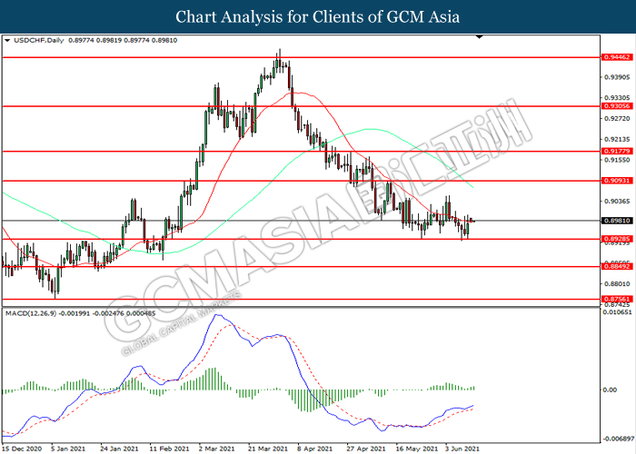 20210614 USDCHF by willy | Jun 14, 2021 | 美元兑瑞士法郎 | 0 comments USDCHF,Daily:美瑞震荡下行,目前测试前期支撑。然而,MACD多头动能略增,短期可关注技术性回调为主。上方关注0.9095压力和0.9175压力,下方关注0.8930支撑和0.8850支撑。