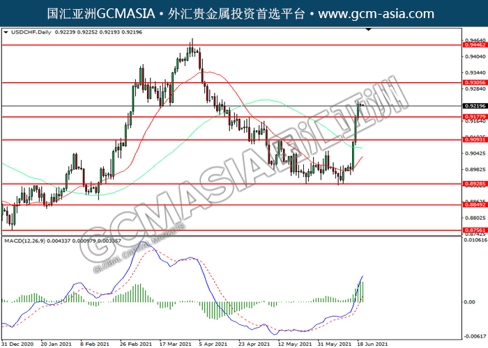 20210621 USDCHF by willy | Jun 21, 2021 | 美元兑瑞士法郎 | 0 comments USDCHF,Daily:美瑞突破前期压力,震荡上行。MACD多头动能略增,若突破可关注多头为主。上方关注0.9305压力和0.9445压力,下方关注0.9180支撑和0.9095支撑。