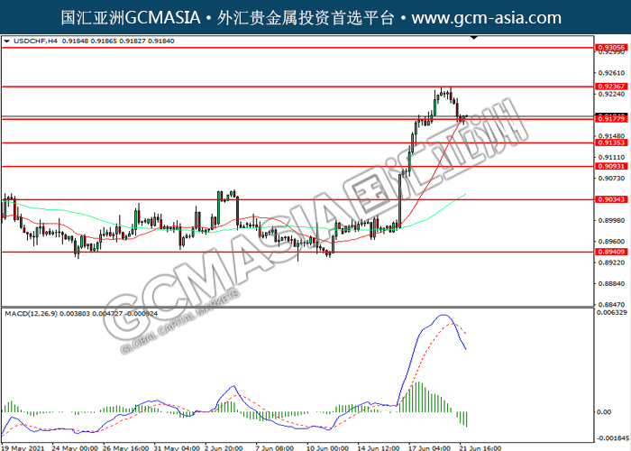 20210622 USDCHF by willy | Jun 22, 2021 | 美元兑瑞士法郎 | 0 comments USDCHF,H4:美瑞震荡下行,目前测试前期支撑。MACD空头动能略增,若下破可关注空头为主。上方关注0.9235压力和0.9305压力,下方关注0.9180支撑和0.9135支撑。