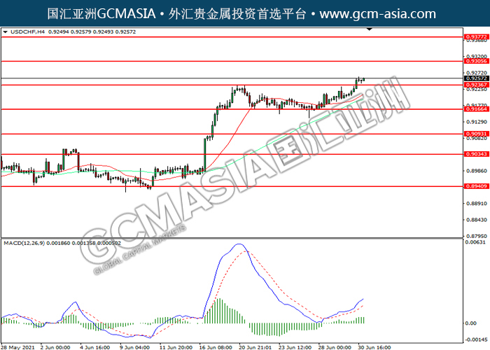20210701 USDCHF by willy | Jul 1, 2021 | 美元兑瑞士法郎 | 0 comments USDCHF,H4: 美瑞震荡上行。MACD多头动能略增,短期可关注多头为主。上方关注0.9305压力和0.9375压力,下方关注0.9235支撑和0.9165支撑。