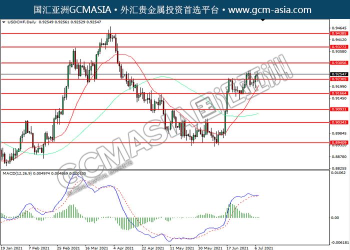 20210708 USDCHF by willy | Jul 8, 2021 | 美元兑瑞士法郎 | 0 comments USDCHF,Daily: 美瑞突破前期压力,震荡上行。然而,MACD多头动能略减,短期可关注技术性回调为主。上方关注0.9305压力和0.9375压力,下方关注0.9230支撑和0.9165支撑。