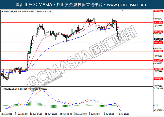 USDCHF,H4:美瑞空头排列,目前测试靠近前期支撑。MACD动能略减,若突破继续看空为主。上方关注0.9195压力和0.9245压力,下方关注0.9135支撑和0.9090支撑。