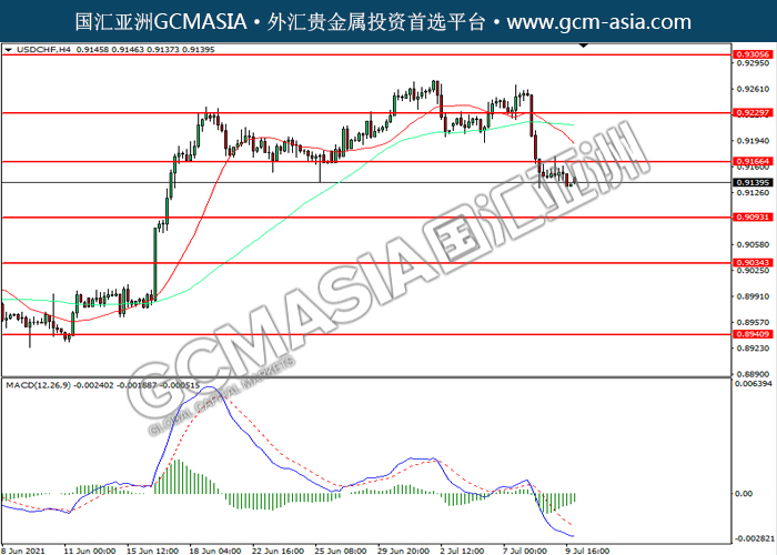 USDCHF,H4: 美瑞下破前期支撑,震荡下行。然而,MACD空头动能略减,短期可关注技术性回调为主。上方关注0.9165压力和0.9230压力,下方关注0.9095支撑和0.9035支撑。