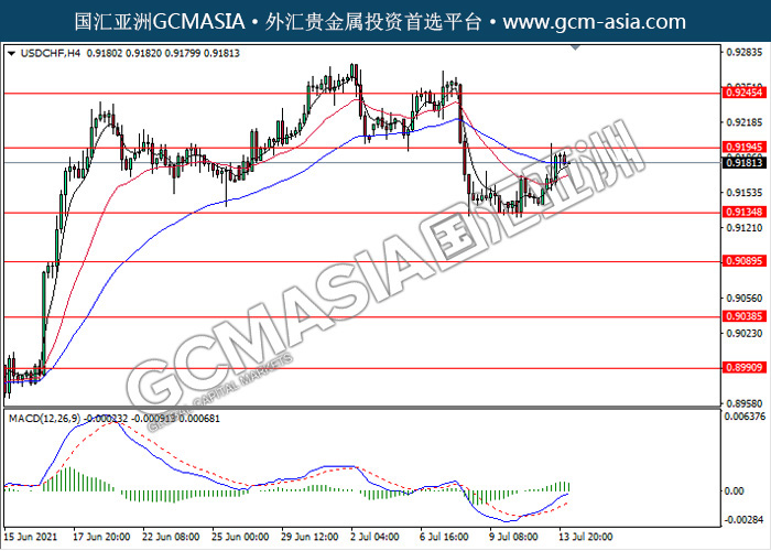 20210714 USDCHF-午间 by keyk | Jul 14, 2021 | 美元兑瑞士法郎 | 0 comments USDCHF,H4:美瑞震荡上行,目前测试靠近前期压力。然而,MACD多头动能开始略减,短期关注技术性空头回调为主。上方关注0.9195压力和0.9245压力,下方关注0.9135支撑和0.9090支撑。
