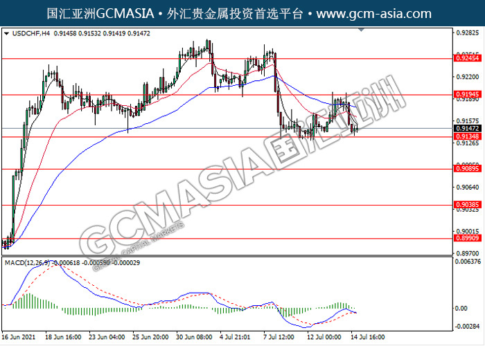 20210715 USDCHF-午间 by keyk | Jul 15, 2021 | 美元兑瑞士法郎 | 0 comments USDCHF,H4:美瑞近期高位承压回落,目前测试前期支撑。然而,MACD多头动能开始略减,若突破可继续看空为主。上方关注0.9195压力和0.9245压力,下方关注0.9135支撑和0.9090支撑。
