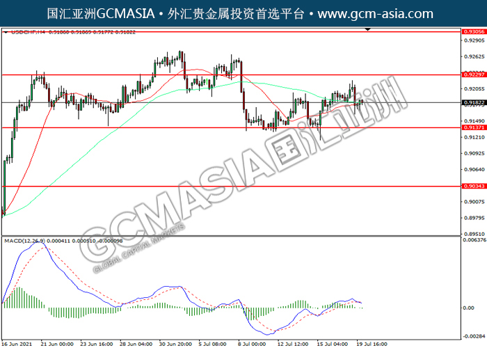 20210720 USDCHF-午间 by willy | Jul 20, 2021 | 美元兑瑞士法郎 | 0 comments USDCHF,H4: 美瑞震荡下行。MACD空头动能略增,短期可关注空头为主。上方关注0.9230压力和0.9305压力,下方关注0.9135支撑和0.9035支撑。