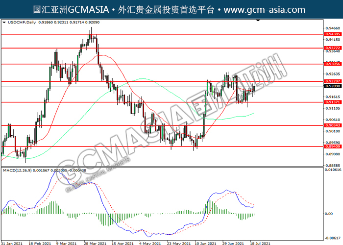 20210721 USDCHF by willy | Jul 21, 2021 | 美元兑瑞士法郎 | 0 comments USDCHF,Daily: 美瑞震荡上行,目前测试前期压力。MACD空头动能略减,若突破可关注多头为主。上方关注0.9230压力和0.9305压力,下方关注0.9135支撑和0.9035支撑。