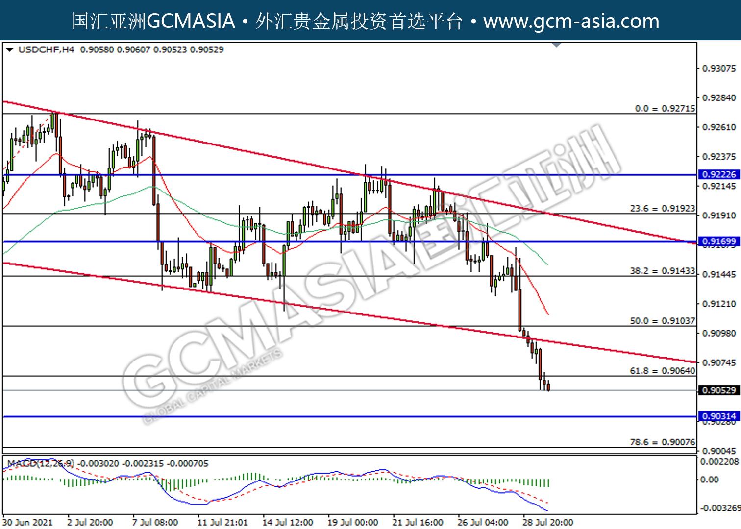 20210730-USDCHF by willy | Jul 30, 2021 | 美元兑瑞士法郎 | 0 comments USDCHF,H4:美瑞空头排列。MACD已形成四叉,动能转若,短期关注空头势力。上方关注0.9065压力和0.9100压力,下方关注0.9030支撑和0.9010支撑。