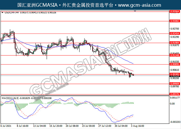 20210804 USDCHF-午间 by keyk | Aug 4, 2021 | 美元兑瑞士法郎 | 0 comments USDCHF,H4:美瑞震荡下行,目前测试前期支撑。然而,MACD多头动能略减,若突破可继续看空为主。上方关注0.9090压力和0.9135压力,下方关注0.9040支撑和0.8990支撑。