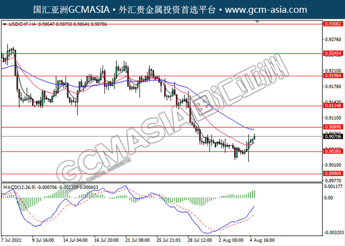 20210805 USDCHF-午间 by keyk | Aug 5, 2021 | 美元兑瑞士法郎 | 0 comments USDCHF,H4:美瑞触底反弹上行。然而,MACD动能持续略增,短期继续关注多头反弹为主。上方关注0.9090压力和0.9135压力,下方关注0.9040支撑和0.8990支撑。