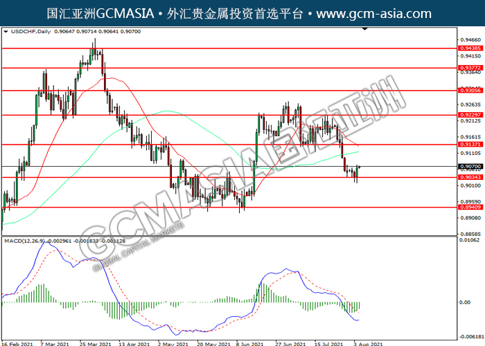 20210805 USDCHF by willy | Aug 5, 2021 | 美元兑瑞士法郎 | 0 comments USDCHF,Daily: 美瑞震荡下行,目前测试前期支撑。然而,1MACD空头动能略减,短期可关注技术性回调为主。上方关注0.9135压力和0.9230压力,下方关注0.9035支撑和0.8940支撑。
