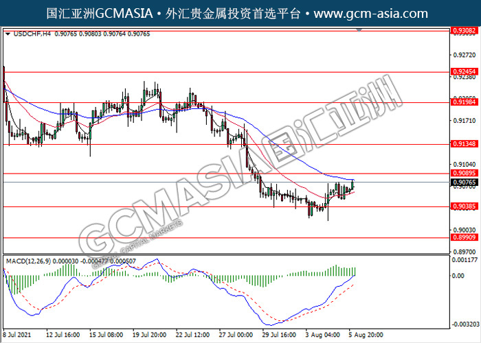 20210806 USDCHF-午间 by keyk | Aug 6, 2021 | 美元兑瑞士法郎 | 0 comments USDCHF,H4:美瑞触底反弹上行,目前测试靠近前期压力。MACD动能持续略增,若突破可继续看多为主。上方关注0.9090压力和0.9135压力,下方关注0.9040支撑和0.8990支撑。