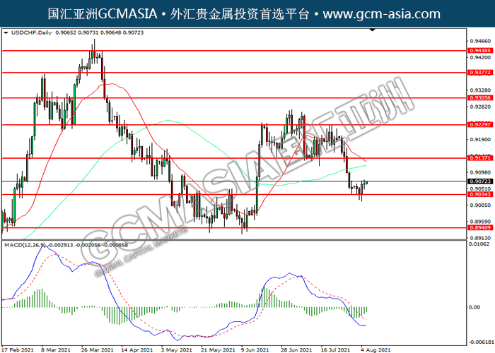 20210806 USDCHF by willy | Aug 6, 2021 | 美元兑瑞士法郎 | 0 comments USDCHF,Daily: 美瑞震荡下行,目前测试前期支撑。然而,MACD空头动能略减,短期可关注技术性回调为主。上方关注0.9135压力和0.9230压力,下方关注0.9035支撑和0.8940支撑。