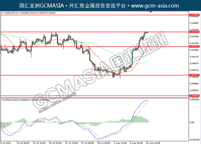 20210811 USDCHF by willy | Aug 11, 2021 | 美元兑瑞士法郎 | 0 comments USDCHF,Daily: 美瑞震荡上行,目前测试前期压力。然而,MACD多头动能略减,短期可关注技术性回调为主。上方关注0.9230压力和0.9305压力,下方关注0.9165支撑和0.9035支撑。