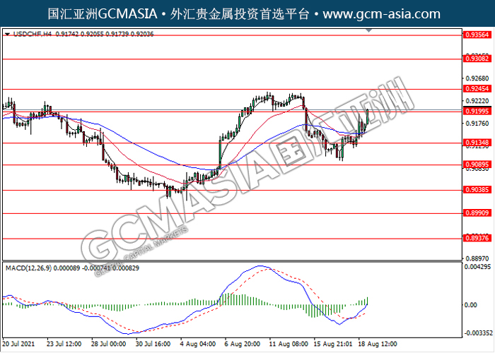 20210819 USDCHF-午间 by keyk | Aug 19, 2021 | 美元兑瑞士法郎 | 0 comments USDCHF,H4:美瑞多头排列,目前测试前期压力。MACD形成金叉,动能略增,若突破可继续看多为主。上方关注0.9200压力和0.9245压力,下方关注0.9135支撑和0.9090支撑。