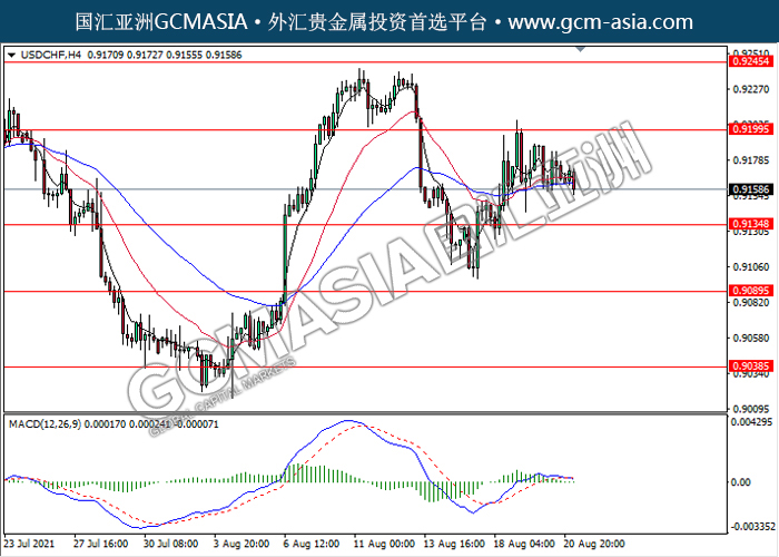 20210823 USDCHF-午间 by keyk | Aug 23, 2021 | 美元兑瑞士法郎 | 0 comments USDCHF,H4:美瑞高位承压回落。MACD多头动能略减,短期可继续看空回调为主。上方关注0.9200压力和0.9245压力,下方关注0.9135支撑和0.9090支撑。