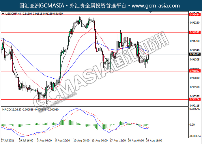 20210825 USDCHF-午间 by keyk | Aug 25, 2021 | 美元兑瑞士法郎 | 0 comments USDCHF,H4:美瑞近期低位反弹上行。MACD形成金叉,空头动能略减,短期可继续看多为主。上方关注0.9200压力和0.9245压力,下方关注0.9100支撑和0.9025支撑。