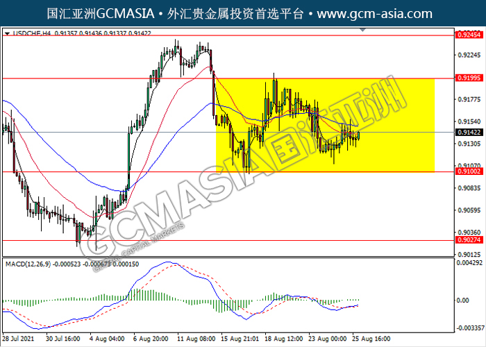20210826 USDCHF-午间 by keyk | Aug 26, 2021 | 美元兑瑞士法郎 | 0 comments USDCHF,H4:美瑞区间震荡交易。MACD形成金叉,动能略增,短期关注多头方向为主。上方关注0.9200压力和0.9245压力,下方关注0.9100支撑和0.9025支撑。