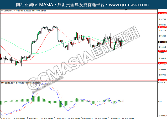 20210901 USDCHF by willy | Aug 31, 2021 | 美元兑瑞士法郎 | 0 comments USDCHF,H4: 美瑞高位承压回落,目前测试前期支撑。MACD多头动能略减,若下破可关注空头为主。上方关注0.9230压力和0.9305压力,下方关注0.9100支撑和0.9035支撑。