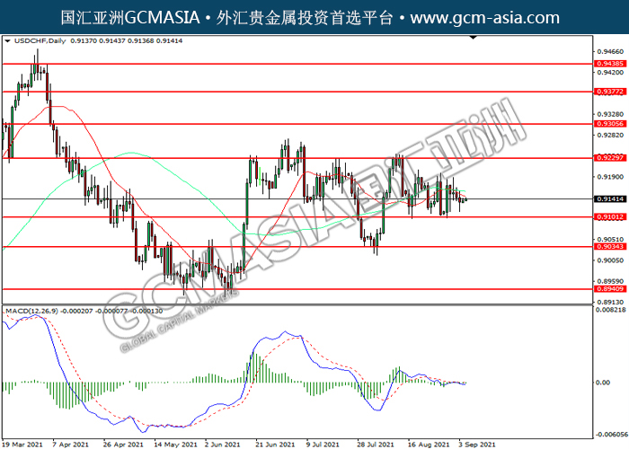20210906 USDCHF by willy | Sep 6, 2021 | 美元兑瑞士法郎 | 0 comments USDCHF,Daily: 美瑞高位承压回落,目前测试前期支撑。MACD空头动能略增,若下破可关注空头为主。上方关注0.9230压力和0.9305压力,下方关注0.9100支撑和0.9035支撑。