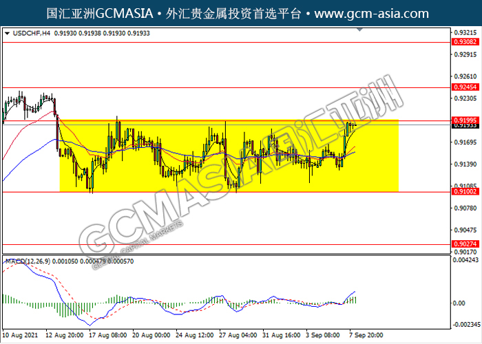 20210908 USDCHF-午间 by keyk | Sep 8, 2021 | 美元兑瑞士法郎 | 0 comments USDCHF,H4:美瑞仍区间震荡盘整,目前测试前期压力。然而,MACD动能略增,若突破可继续看多为主。上方关注0.9200压力和0.9245压力,下方关注0.9100支撑和0.9025支撑。
