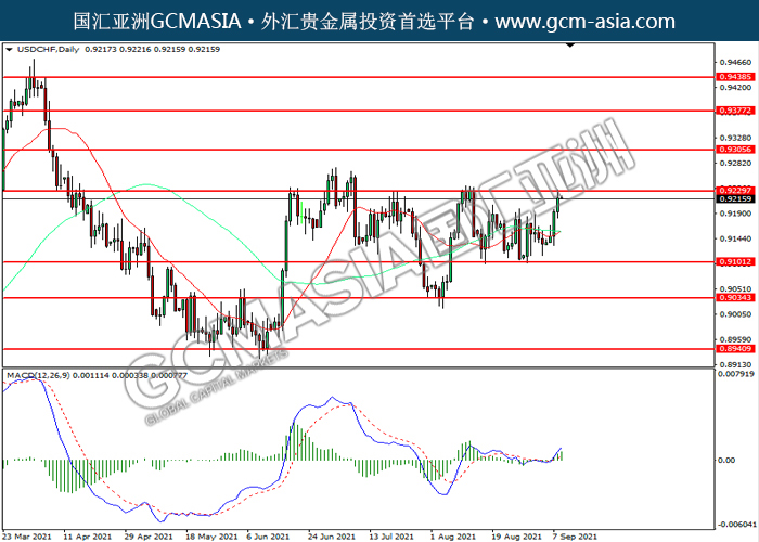 20210909 USDCHF by willy | Sep 9, 2021 | 美元兑瑞士法郎 | 0 comments USDCHF,Daily: 美瑞低位反弹。MACD多头动能略增,短期可关注多头为主。上方关注0.9230压力和0.9305压力,下方关注0.9100支撑和0.9035支撑。