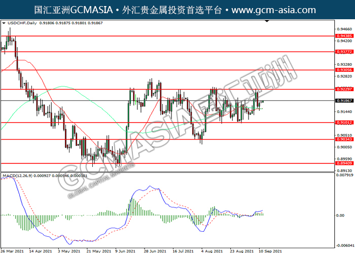 USDCHF,Daily: 美瑞高位回落。MACD多头动能略减,短期可关注空头为主。上方关注0.9230压力和0.9305压力,下方关注0.9100支撑和0.9035支撑。