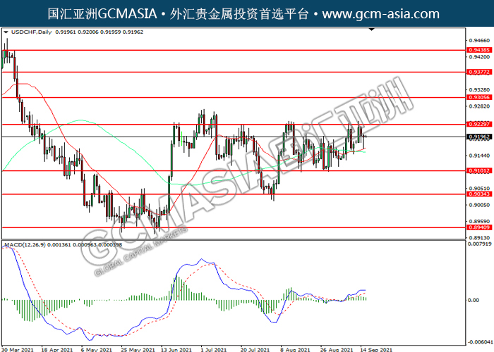20210916 USDCHF by willy | Sep 16, 2021 | 美元兑瑞士法郎 | 0 comments USDCHF,Daily: 美瑞震荡上行,目前测试前期压力。然而,MACD多头动能略减,短期可关注技术性回调为主。上方关注0.9230压力和0.9305压力,下方关注0.9100支撑和0.9035支撑。