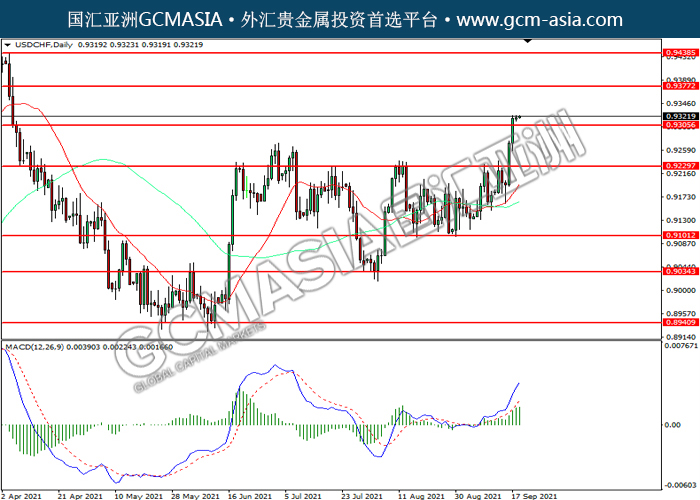 USDCHF,Daily: 美瑞突破前期压力,震荡上行。MACD多头动能略增,短期可关注多头为主。上方关注0.9380压力和0.9440压力,下方关注0.9305支撑和0.9330支撑。