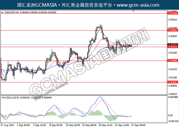 20210927 USDCHF-午间 by keyk | Sep 27, 2021 | 美元兑瑞士法郎 | 0 comments USDCHF,H4:美瑞震荡盘整靠近前期支撑。然而,MACD显示多头信号,动能略增,短期可关注多头方向为主。上方关注0.9310压力和0.9375压力,下方关注0.9240支撑和0.9185支撑。