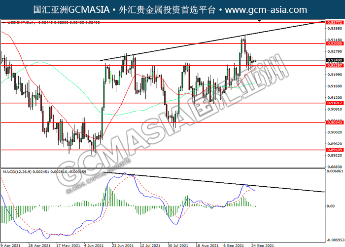 20210927 USDCHF by willy | Sep 27, 2021 | 美元兑瑞士法郎 | 0 comments USDCHF,Daily: 美瑞高位回落。MACD空头动能略增,若下破可关注空头为主。上方关注0.9305压力和0.9375压力,下方关注0.9330支撑和0.9100支撑。