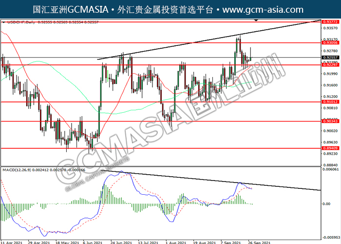 20210928 USDCHF by willy | Sep 28, 2021 | 美元兑瑞士法郎 | 0 comments USDCHF,Daily: 美瑞高位回落,目前测试前期支撑。MACD空头动能略增,若下破可关注空头为主。上方关注0.9305压力和0.9375压力,下方关注0.9330支撑和0.9100支撑。