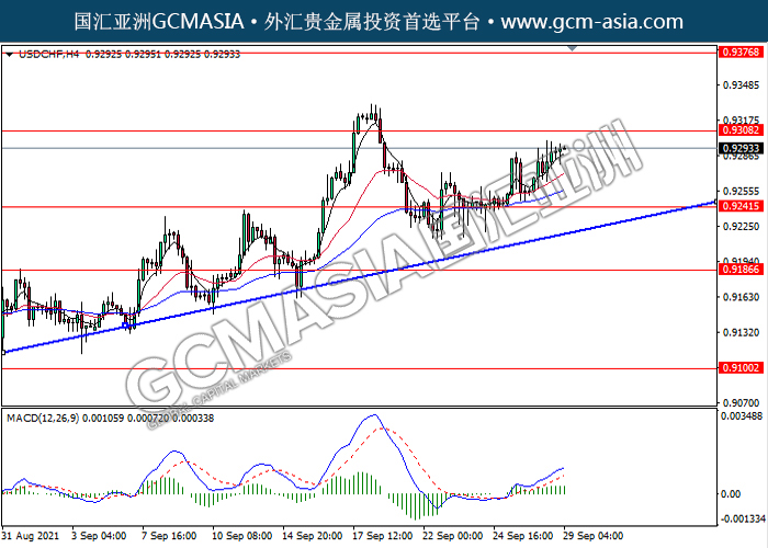 20210929 USDCHF-午间 by keyk | Sep 29, 2021 | 美元兑瑞士法郎 | 0 comments USDCHF,H4:美瑞震荡上行,目前测试靠近前期压力。MACD动能持续略增,若突破继续看多为主。上方关注0.9310压力和0.9375压力,下方关注0.9240支撑和0.9185支撑。