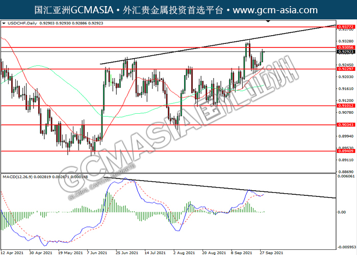 20210929 USDCHF by keyk | Sep 29, 2021 | 美元兑瑞士法郎 | 0 comments USDCHF,Daily: 美瑞震荡上行,目前测试前期压力。MACD多头动能略增,若突破可关注多头为主。上方关注0.9305压力和0.9375压力,下方关注0.9330支撑和0.9100支撑。