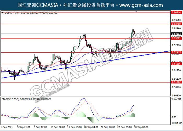 20210930 USDCHF-午间 by keyk | Sep 30, 2021 | 美元兑瑞士法郎 | 0 comments USDCHF,H4:美瑞高位承压回落。MACD多头动能略减,短期可继续看空回调为主。上方关注0.9375压力和0.9430压力,下方关注0.9310支撑和0.9240支撑。