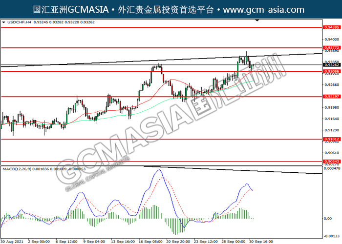 20211001 USDCHF by keyk | Oct 1, 2021 | 美元兑瑞士法郎 | 0 comments USDCHF,H4: 美瑞震荡下行,目前测试前期支撑。MACD多头动能略减,若下破可关注空头为主。上方关注0.9375压力和0.9440压力,下方关注0.9305支撑和0.9330支撑。