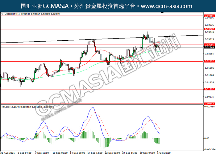 20211004 USDCHF by keyk | Oct 4, 2021 | 美元兑瑞士法郎 | 0 comments USDCHF,H4: 美瑞震荡下行,目前测试前期支撑。MACD空头动能略增,若下破可关注空头为主。上方关注0.9375压力和0.9440压力,下方关注0.9305支撑和0.9330支撑。