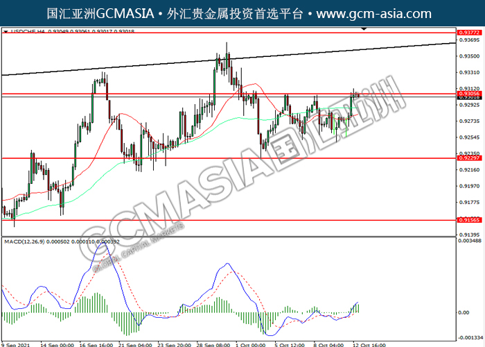 20211013 USDCHF by willy | Oct 13, 2021 | 美元兑瑞士法郎 | 0 comments USDCHF,H4: 美瑞震荡上行。MACD多头动能略增,短期可关注多头为主。上方关注0.9305压力和0.9375压力,下方关注0.9330支撑和0.9155支撑。