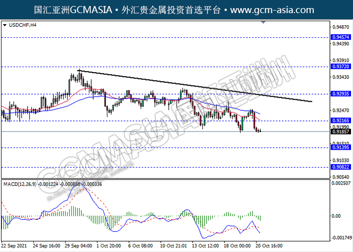20211021 USDCHF-午间 by keyk | Oct 21, 2021 | 美元兑瑞士法郎 | 0 comments USDCHF,H4:美瑞突破前期支撑,震荡下行。MACD形成死叉,动能略减,短期继续关注空头方向为主。上方关注0.9215压力和0.9295压力,下方关注0.9140支撑和0.9080支撑。