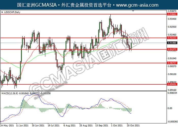20211026 USDCHF by willy | Oct 26, 2021 | 美元兑瑞士法郎 | 0 comments USDCHF,H4: 美瑞震荡下行,目前测试前期支撑。然而,MACD空头动能略减,短期可关注技术性回调为主。上方关注0.9225压力和0.9365压力,下方关注0.9155支撑和0.9075支撑。